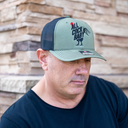 Military Green Signature ACB Trucker Hat – Black Embroidery with Red Comb